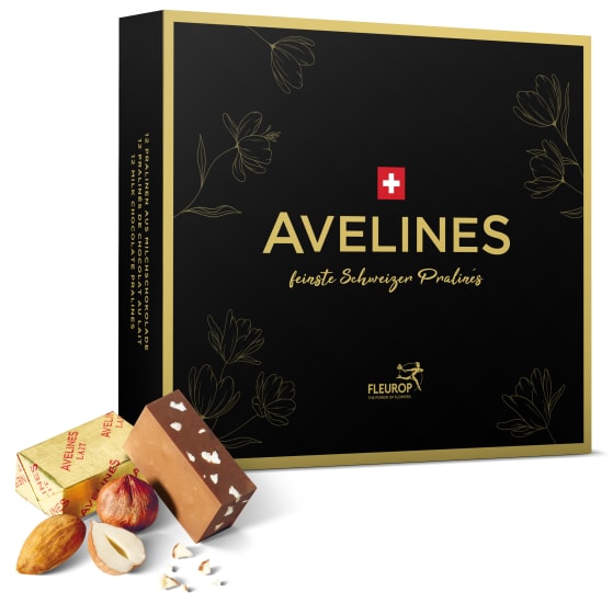Cette élégante boîte contient 12 pralinés Avelines (120 g) au chocolat au lait gianduja et noisettes fondant. Cette composition raffinée ne contient que les meilleurs ingrédients provenant de sources soigneusement sélectionnées: des fèves de cacao, du lait entier suisse, des noisettes délicatement torréfiées, des amandes et de la véritable vanille Bourbon moulue.